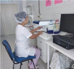 Сапаны бақылау бөлімшеснінің зертхана маманы Жайлауова Гүлназ Кеңесқызы қан компоненттерінің сапасын яғни гемоглобин, гематокрит көрсеткіштерін гематологиялық автоматты талдауышта зерттеуде.