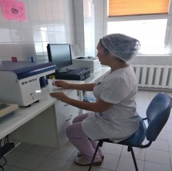 Сапаны бақылау бөлімшесінің фельдшер зертханашысы Қожанберген Мадина жартылай автоматтандырылған биохимиялық талдауыш «АЕ-600» жабдығы арқылы қан компонентінің қалдық ақуыз көрсеткішін анықтауда.