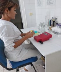 Сапаны бақылау бөлімшеснінің зертхана маманы Жайлауова Гүлназ Кеңесқызы қан компоненттеріндегі бос гемоглобин көрсеткішін анықтауда.