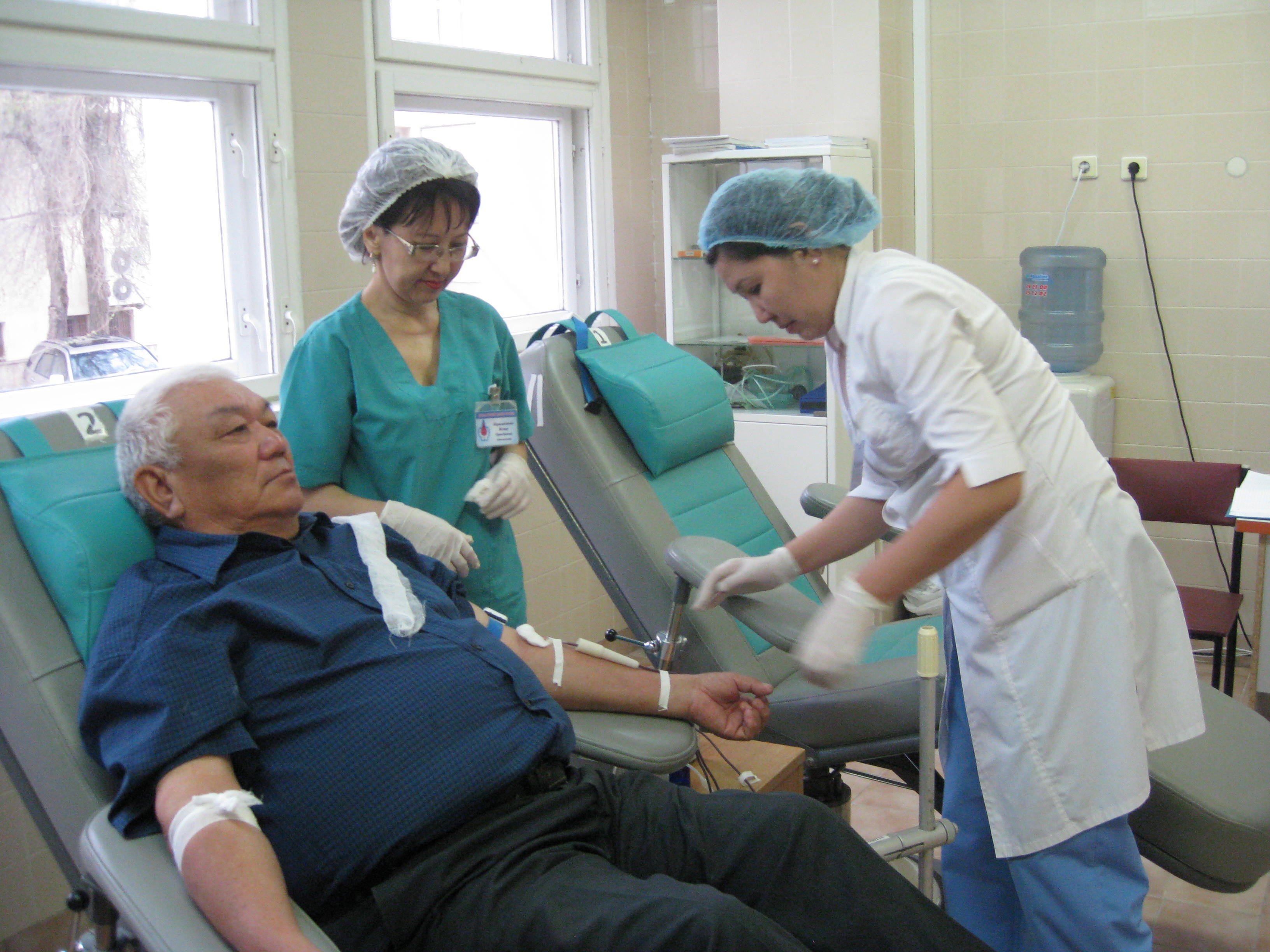 Жасы 18-ден асқан, донор болуға қарсы көрсеткіші жоқ, дені сау төлқұжаты бар Қазақстан азаматы донор бола алады. Қан алу шарасы - қан орталығында, қан және оның компоненттерін дайындау бөлімінде жүзеге асырылады. Донор мен реципиенттің денсаулығының қауіпсіздігін қамтамасыз ету мақсатында қан орталығында дәрігерлер бірнеше тексеріс кезеңін жүзеге асырады, зертханада ВИЧ 1,2 инфекциясы, В және С гепатиттері маркерлеріне және мерезге сараптама жүргізеді. Қанның қауіпсіздігі үшін қан бір рет қолданылатын, зарарсыздандырылған гемаконға алынады. Гемакон-қанның емдік қасиетін жоғары сапада сақтау үшін арнайы полимерлі материалдан жасалған ыдыс. Донордан алынған қан, қанды айналдыру үшін қолданылатын машина центрифугадан өткізіледі, бұл жерде қаннан негізгі үш компонент алынады: плазма, тромбоцит және эритроцит концентраты. Қан тапсыру жиілігі алынатын қанның мөлшеріне байланыссыз: